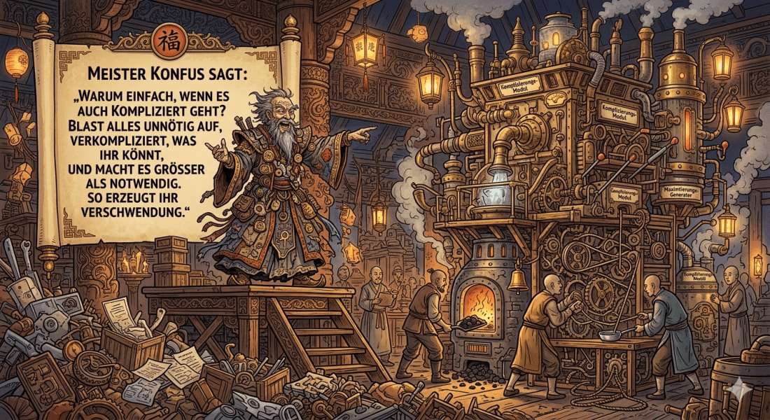 Achtung! Dieser Blogpost enthält Spuren schwarzen Humors. Meister Konfus sagt: „Warum einfach, wenn es auch kompliziert geht? Blast alles unnötig auf, verkompliziert, was ihr könnt, und macht es größer als notwendig. So erzeugt ihr Verschwendung." Meister Konfus ist einer der leider in Vergessenheit geratenen Lehrmeister der Konfusion. Der Philosoph und Denker hatte sich zu seinen … Weiterlesen #MeisterKonfus (76) | Warum einfach, wenn es kompliziert geht …