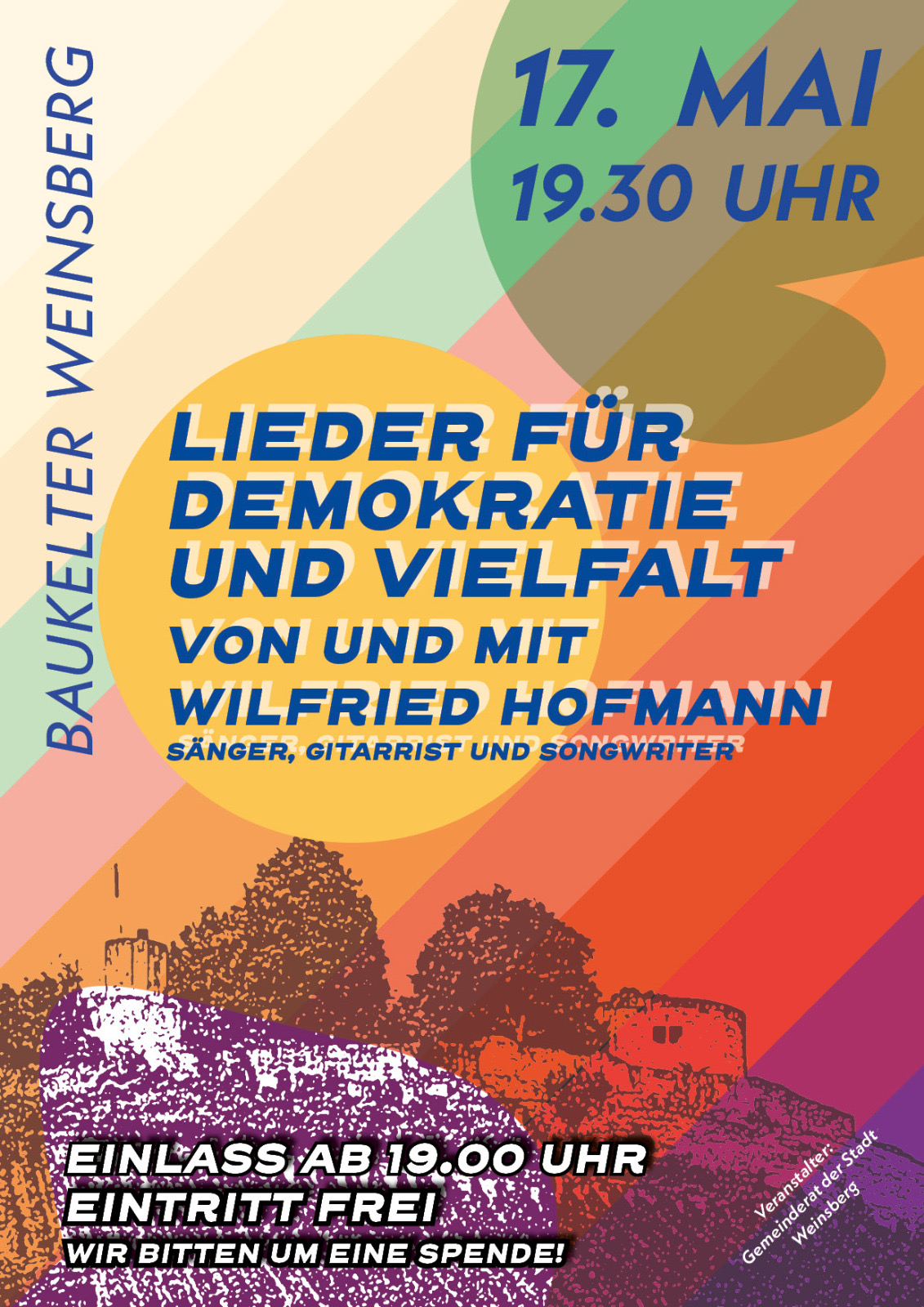 Am 17. Mai 2024 veranstaltet der Gemeinderat der Stadt Weinsberg gemeinsam mit dem Brackenheimer Liedermacher Wilfried Hofmann einen Liederabend zum Thema Demokratie und Vielfalt in der Baukelter in Weinsberg. Beginn ist um 19.30 Uhr. Der Liederabend des ehemaligen Geschichtslehrers Hofmann schlägt mit seinem Programm einen Bogen der Demokratie- und Menschenrechtsgeschichte vom Bauernkrieg über die Vormärz-Revolution 1848 und die Weimarer Republik bis in die Nachkriegszeit der Bundesrepublik und die Gegenwart. Im Anschluss feiert die Videodokumentation der Kundgebung “Wir in Weinsberg für Vielfalt und Demokratie” vom März dieses Jahres Premiere. Das Motto: Unser höchstes Gut ist die Demokratie und unser Grundgesetz. Für das leibliche Wohl sorgt der Gemeinderat von Weinsberg. Der Eintritt ist frei. Um Spenden wird gebeten.